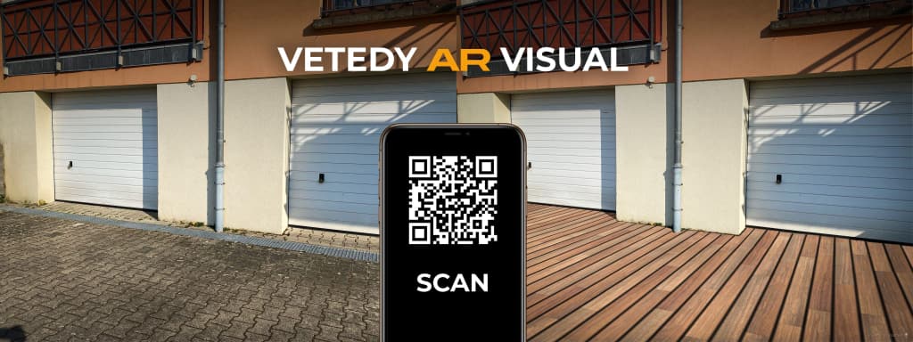 Vetedy AR Visual uses the acronym AR for Augmented Reality which is a technology that superimposes on reality its digital representation updated in real time. This somewhat complex definition means that thanks to augmented reality you can simulate a Vetedy deck directly in your garden or on your balcony, for example.