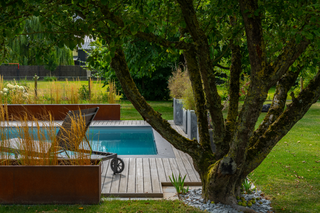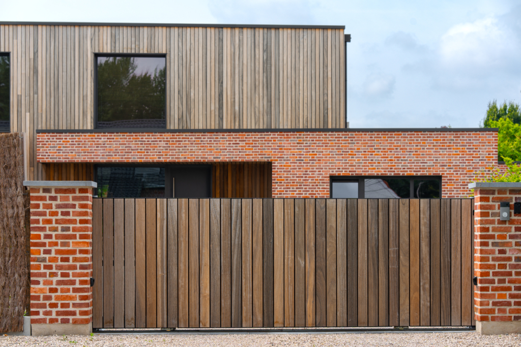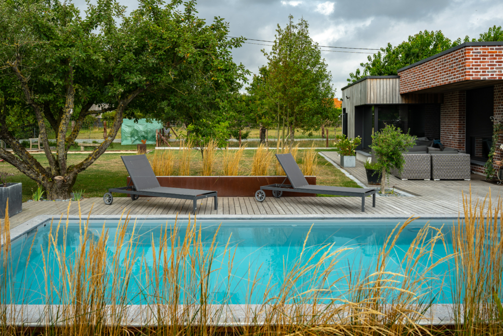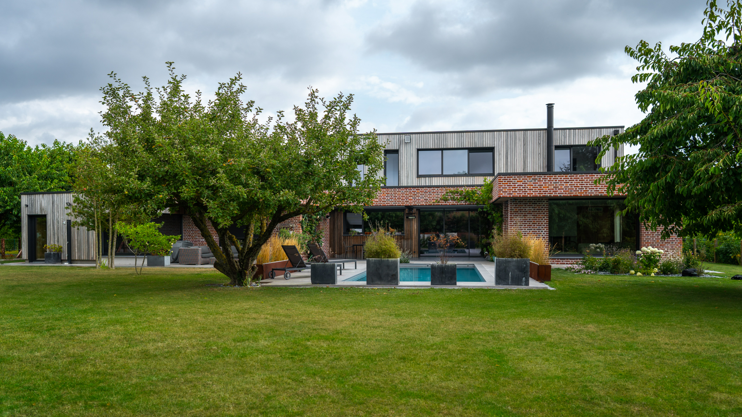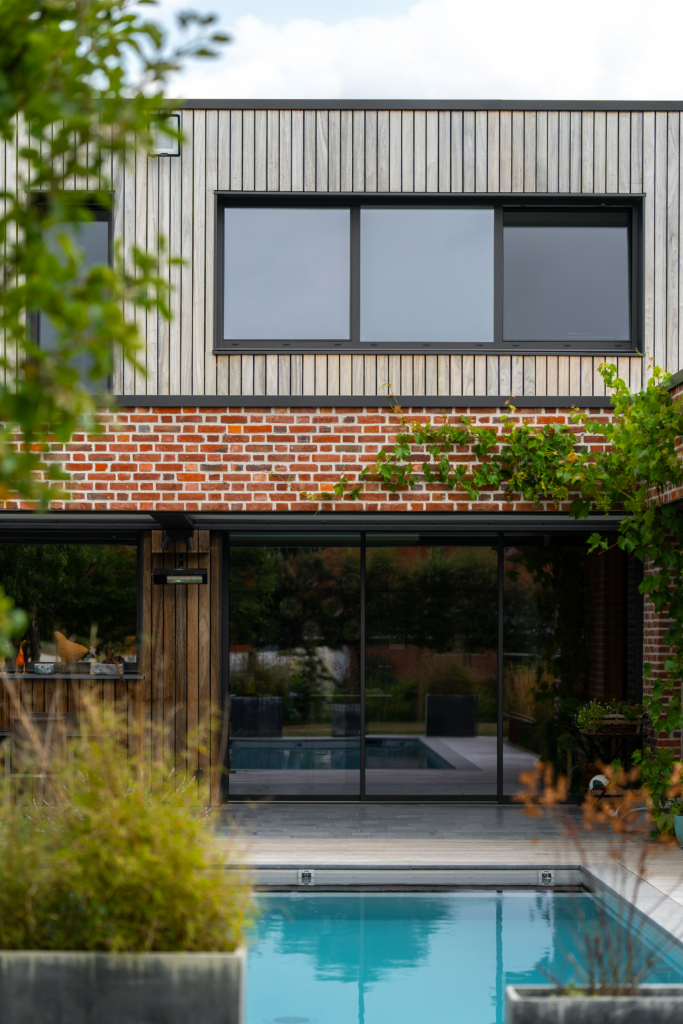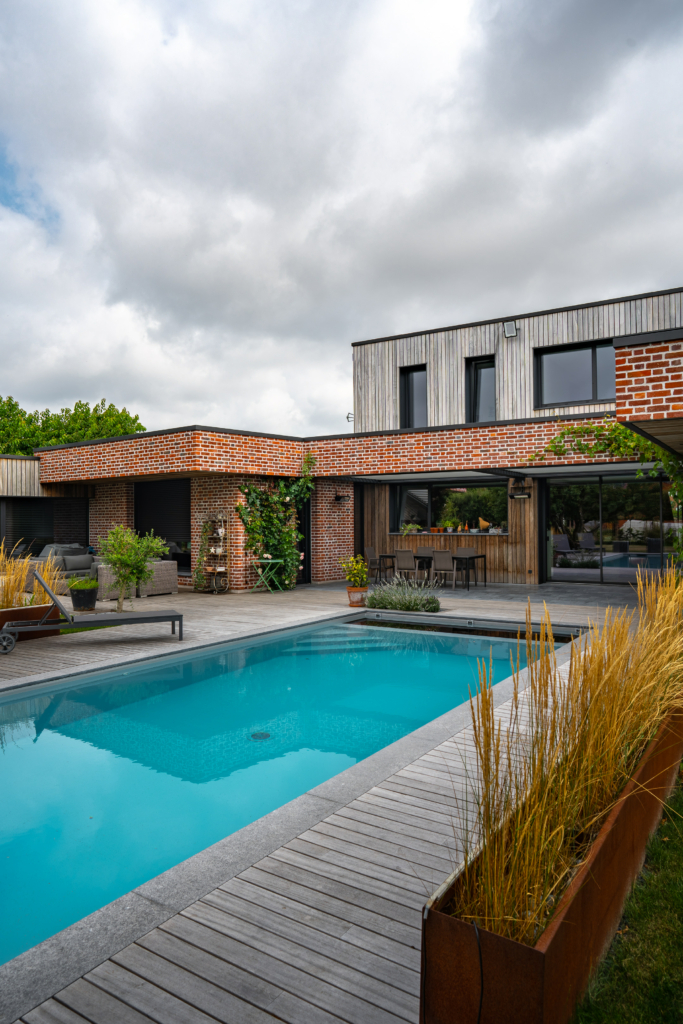 Le chantier de bardage a commencé au cœur de l’hiver 2021, avec le travail de la société Solution Habitat dirigée par M. Nicolas Meert (Thivencelle 59), expert en pose de bardage Vetedy depuis plusieurs années maintenant. Ainsi, le bois était déjà patiné lors de l’emménagement des clients afin qu’ils puissent profiter des magnifiques contrastes entre le padouk grisé et la brique rouge. En toute dernière phase,  les plages de piscine furent posées.