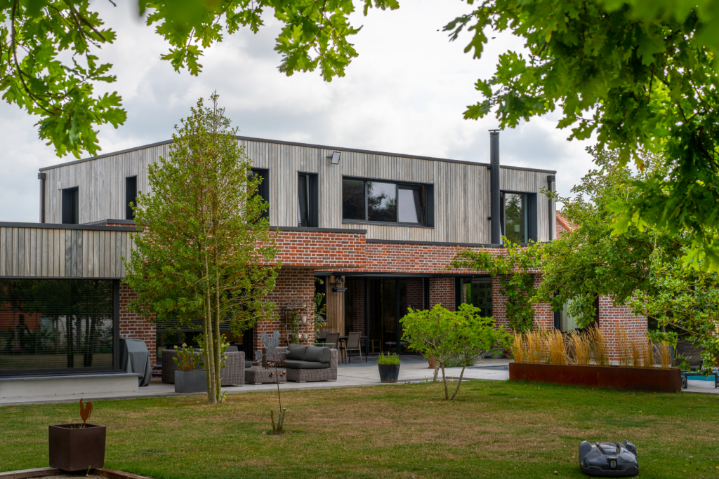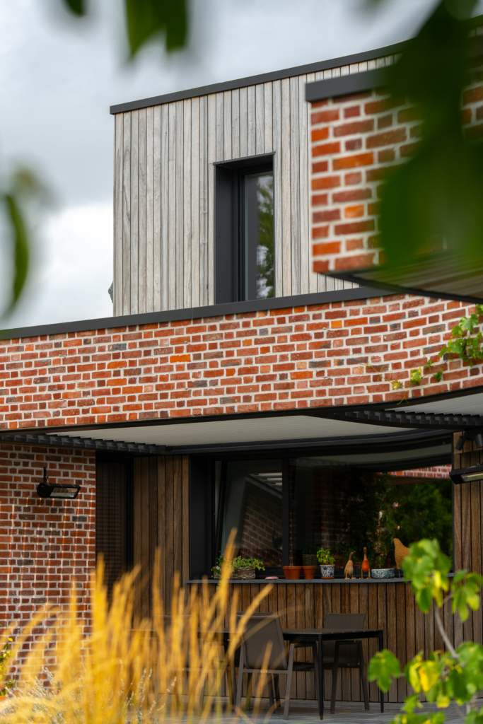 Marier dans le temps un bardage bois avec une brique rouge typique du nord de la France afin de garantir à la construction une architecture à la fois contemporaine et respectant le style local.