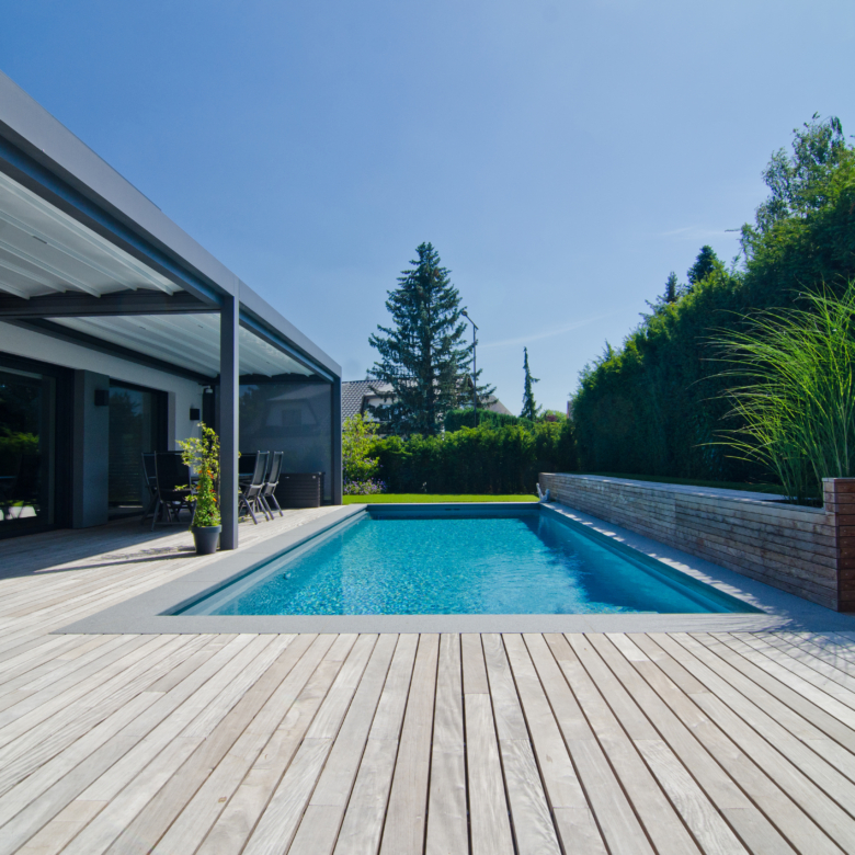 Une terrasse en padouk softline qui s’associe parfaitement aux dalles en pierre en bord de piscine